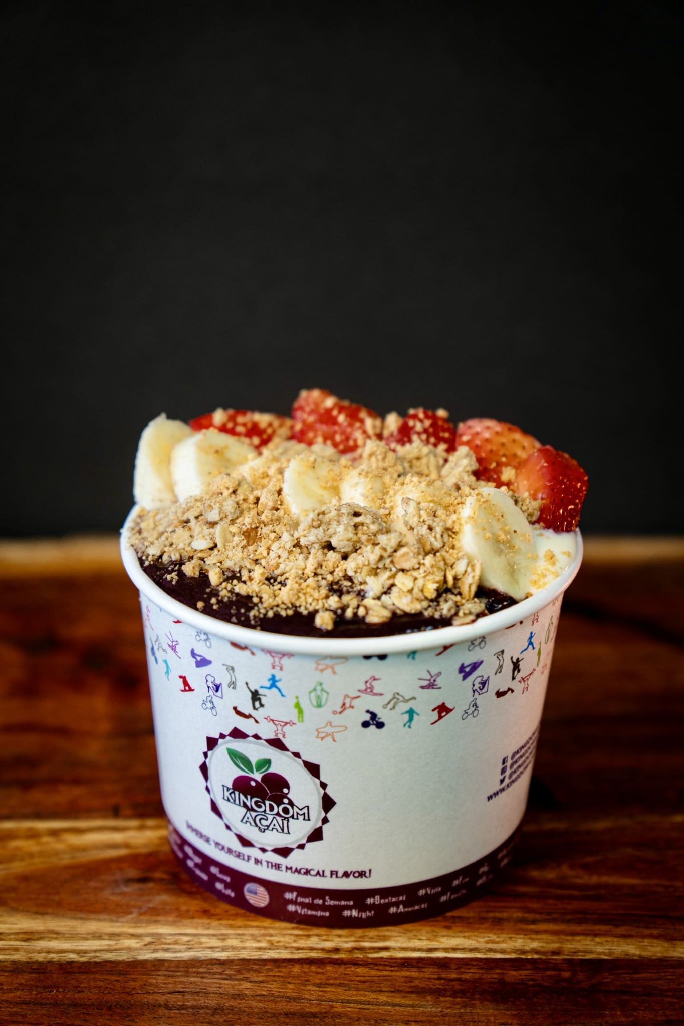 With milk cream. Toppings: banana, strawberry, granola & powdered peanut butter.